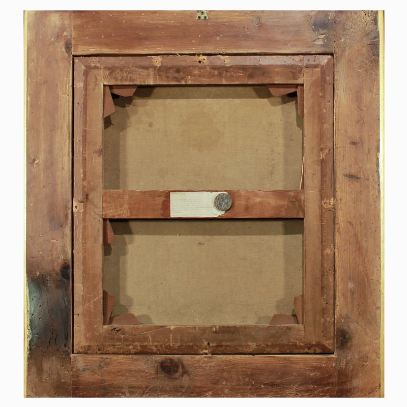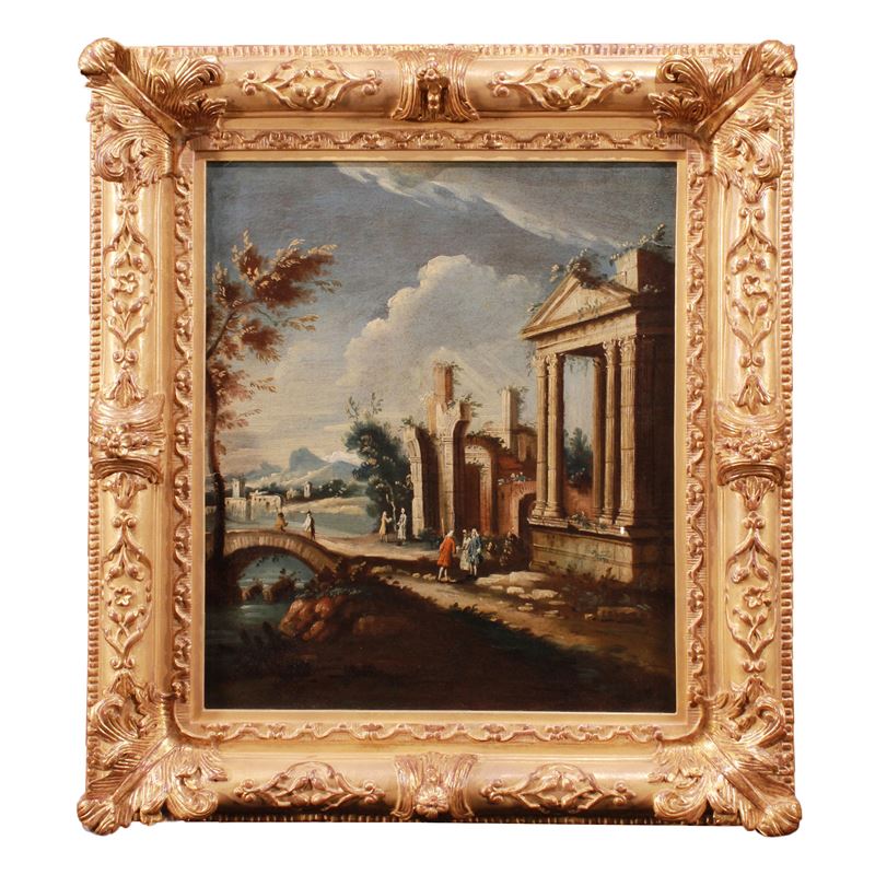 "Capriccio con rovine classiche e figure", olio su tela, entro cornice in legno dorato