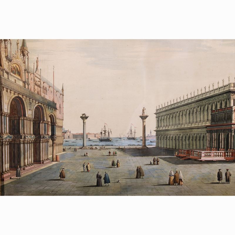 "Veduta di Piazza San Marco", acquerello su carta, entro cornice in legno dorato