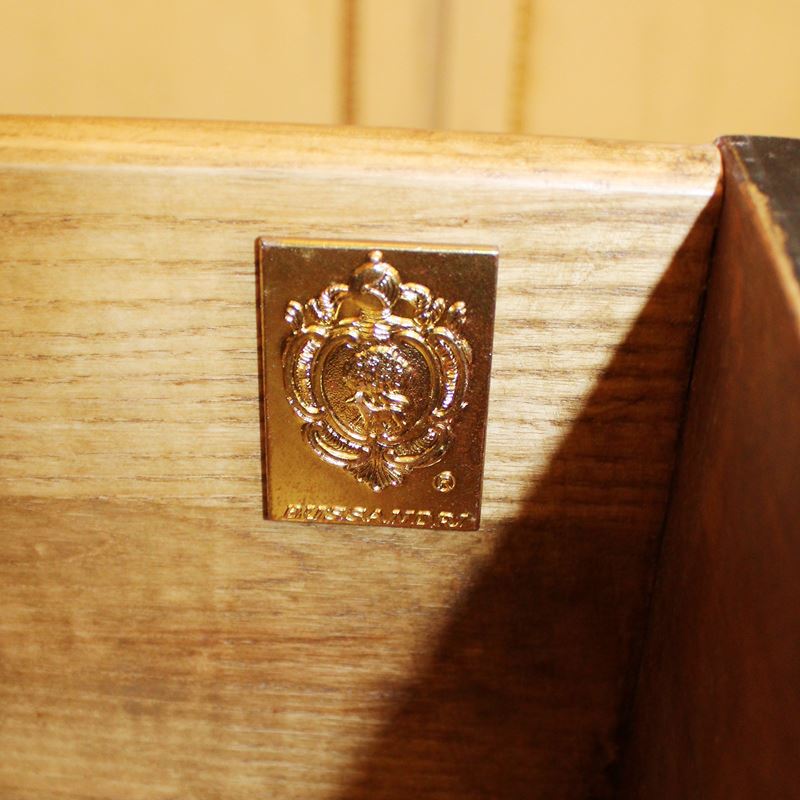 piano rettangolare con tre cassetti sottostanti, decorato con elementi e maniglie argentate