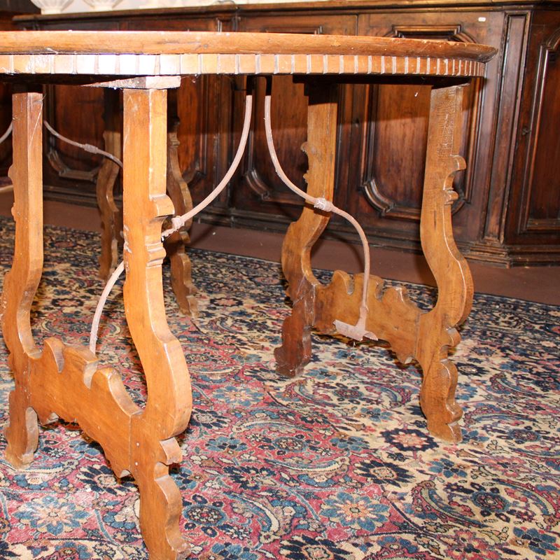 piano a demilune poggianti su sostegni di linea sagomata riuniti da elementi in ferro, unibili a tavolo. lievi difetti