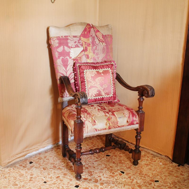struttura tornita con braccioli di linea sagomata, sedute e schienali imbottiti e rivestiti in tessuto con difetti