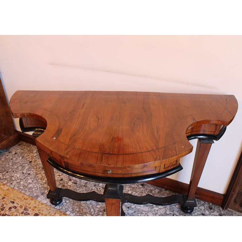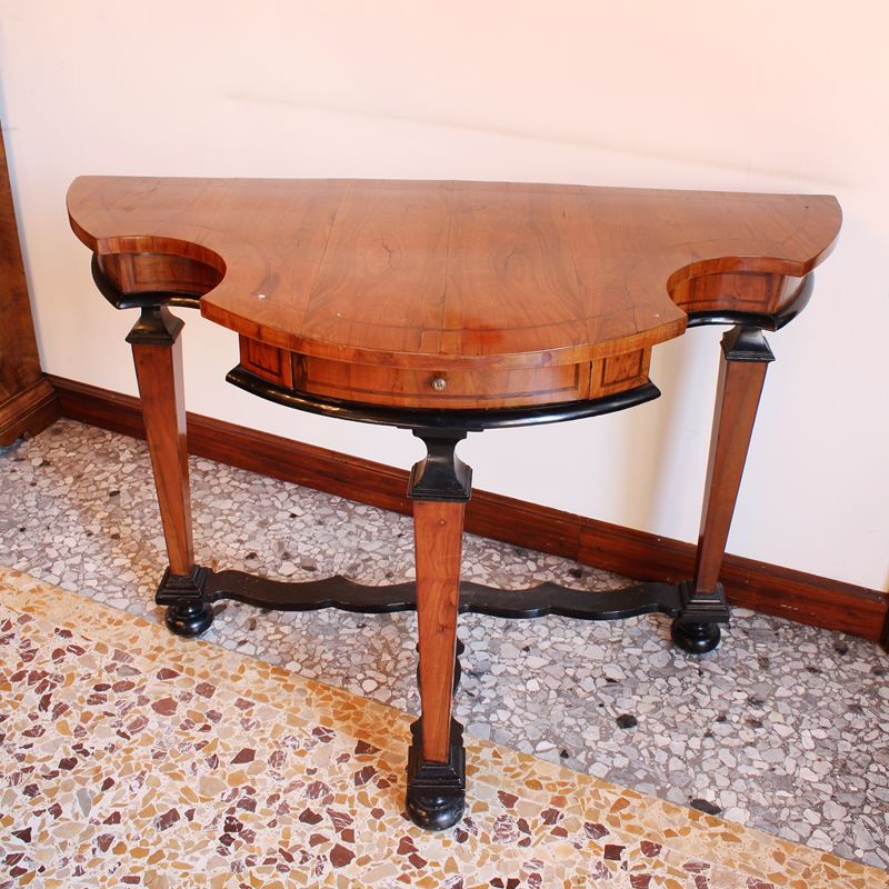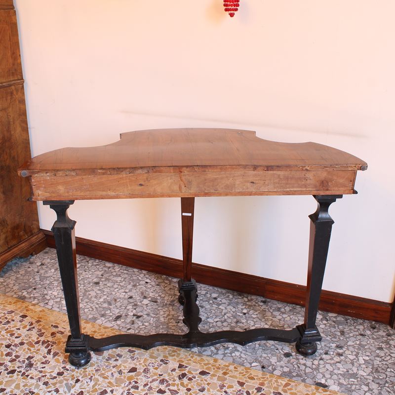 piano sagomato con un cassetto sottostante poggiante su tre sostegni troncopiramidali riuniti al centro da crociera, lievi difetti
