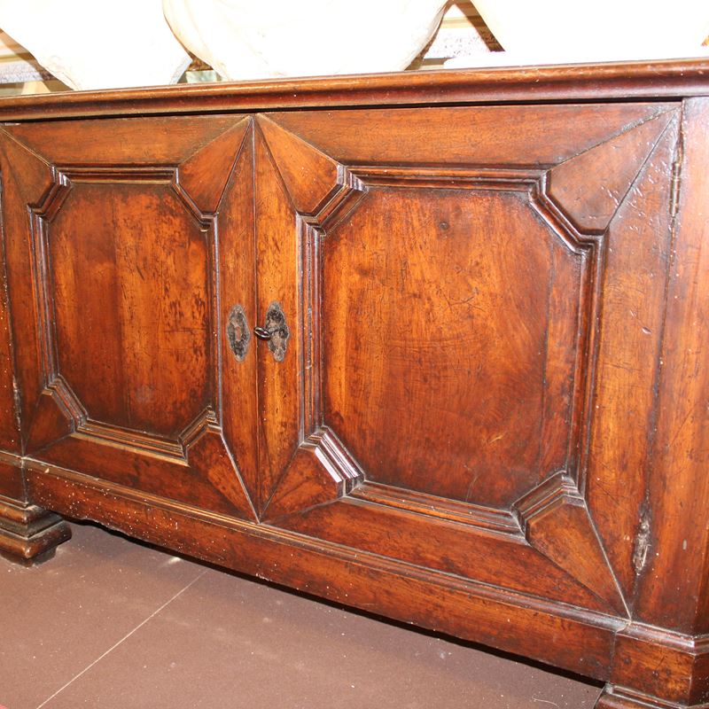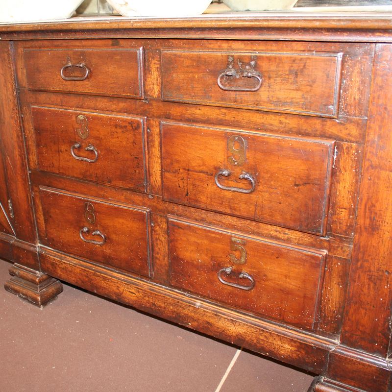 piano rettangolare con quattro sportelli e sei cassetti sottostanti, lievi difetti