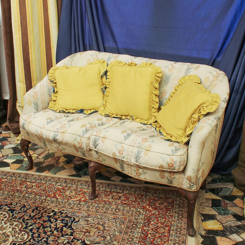 struttura imbottita e rivestita in tessuto, poggiante su gambe in noce di linea sagomata, difetti