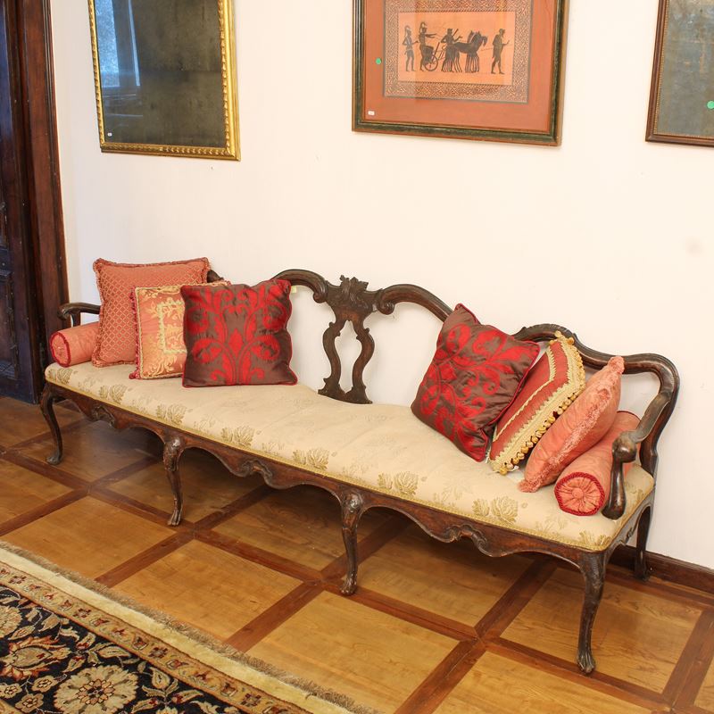 struttura intagliata e traforata con motivi di volute vegetali, braccioli di linea mossa, seduta imbottita e rivestita in tessuto