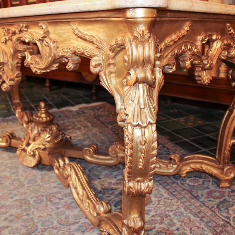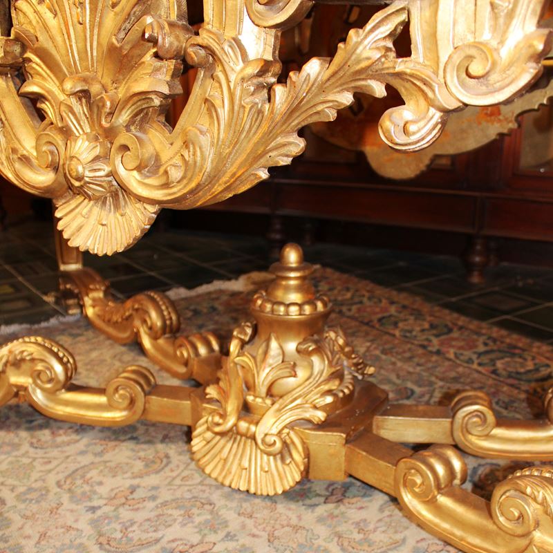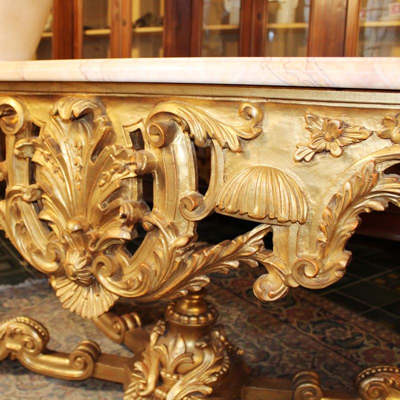 piano sagomato in marmo, base intagliata con ricchi motivi floreali e vegetali, gambe sagomate riunite al centro da crociera