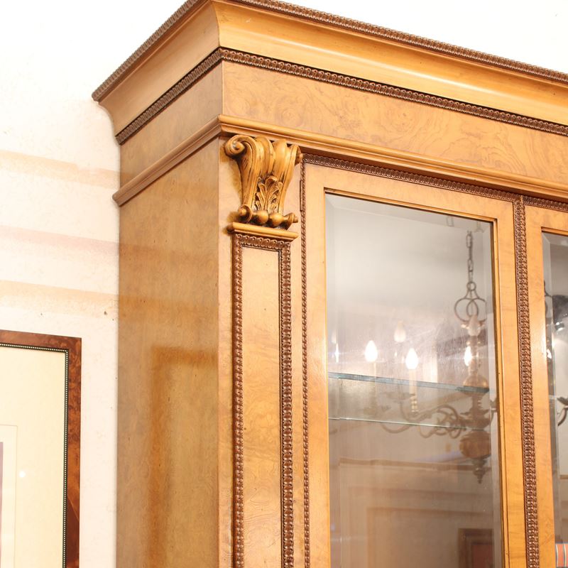 fronte con ripiani e sportelli vari, di cui quattro a vetri, corpo decorato con elementi in legno intagliato con motivi vegetali