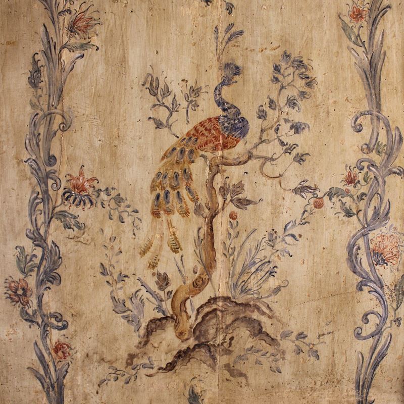 decorato con volatili, motivi vegetali e floreali, fronte a due sportelli, usure