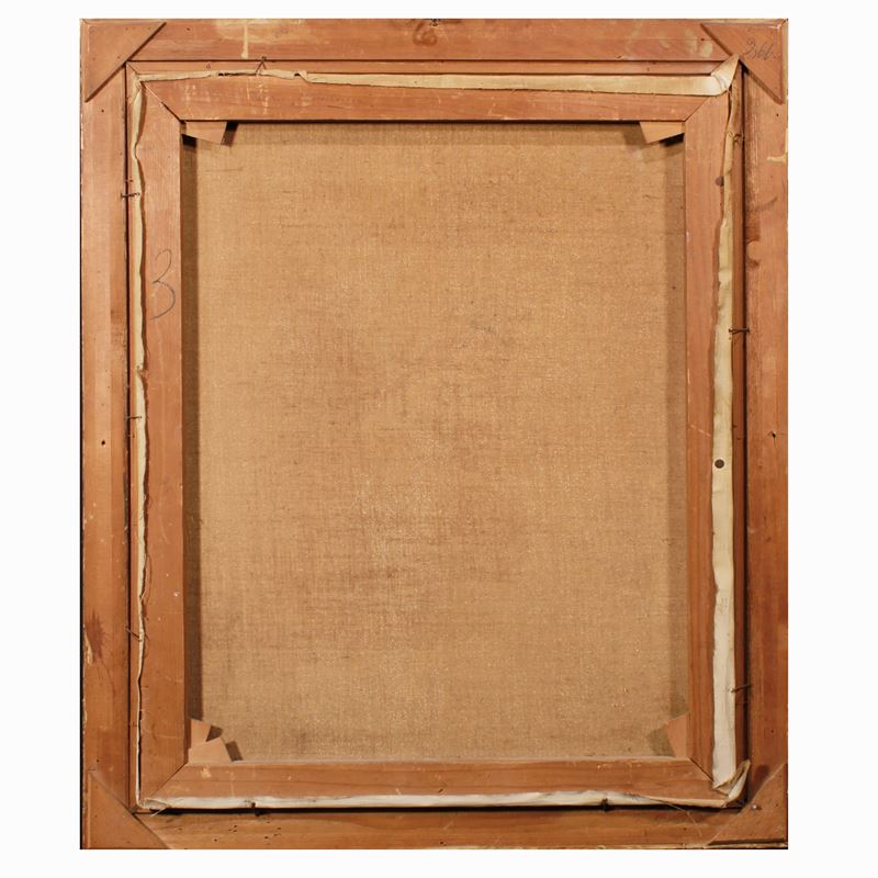"Marina con barche", olio su tela, entro cornice in legno laccata e parzialmente dorata