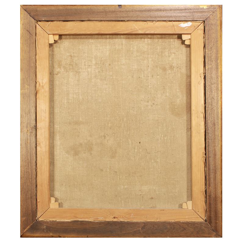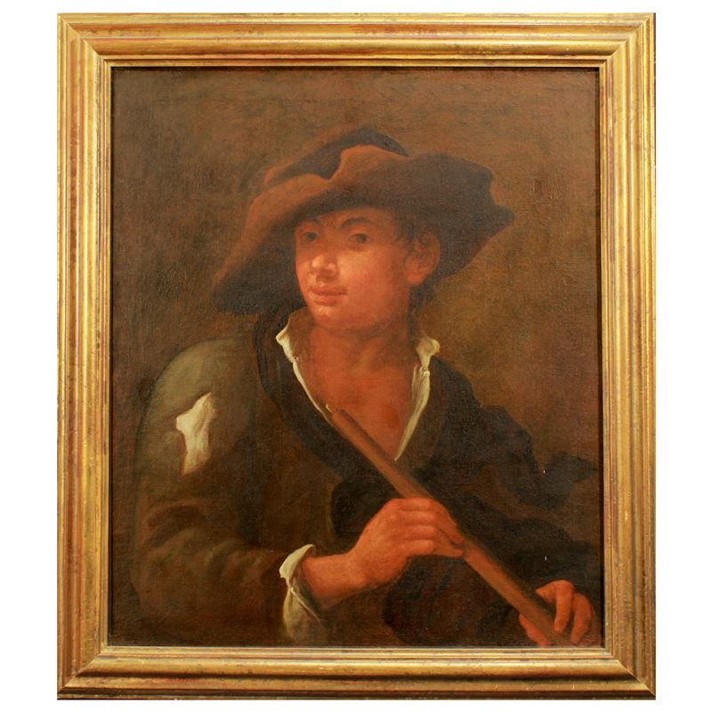 "Pastore con flauto", olio su tela, entro cornice in legno dorato