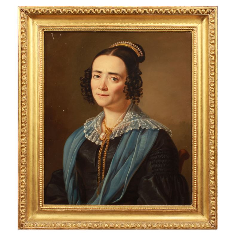 "Ritratto di nobildonna", olio su tela, entro cornice in legno dorato