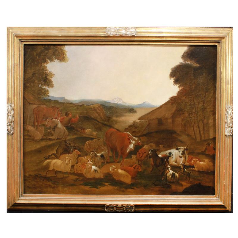 "Paesaggio con armenti", olio su tela, entro cornice in legno dorato