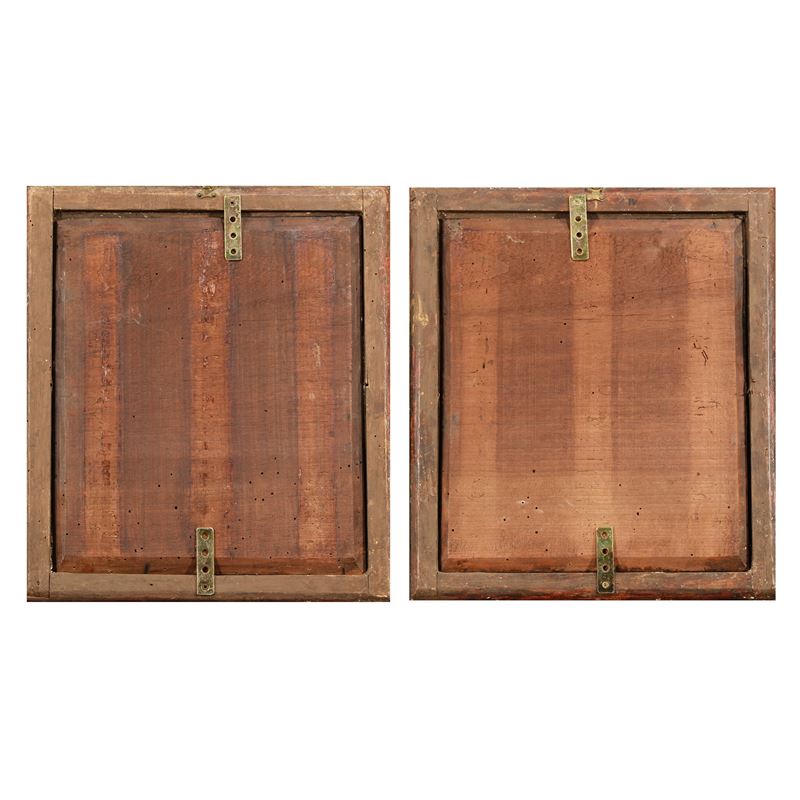 "Scene di genere", coppia di oli su tavola, entro cornice in legno parzialmente dorato