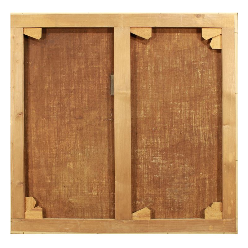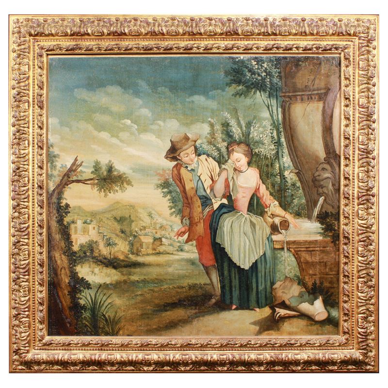 "Paesaggio con scena galante", olio su tela, entro cornice in legno dorato