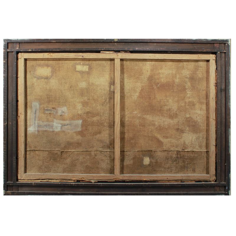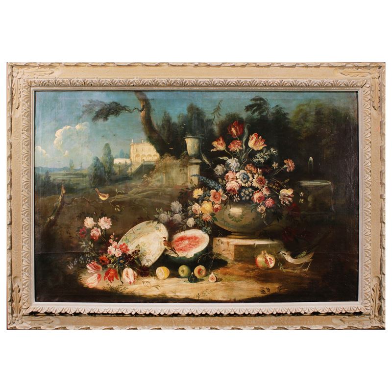 "Natura morta con paesaggio", olio su tela, entro cornice in legno laccato