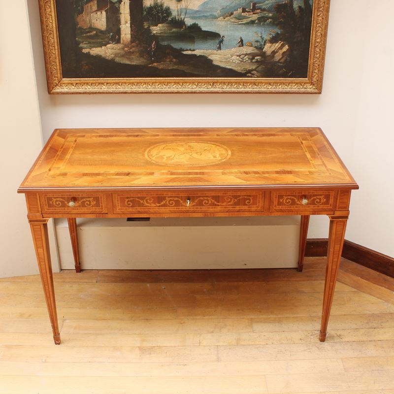 corpo intarsiato con motivi vegetali, piano rettangolare centrato da una scena con personaggi entro riserva, fascia sottostante con tre cassetti poggiante su gambe troncopiramidali
