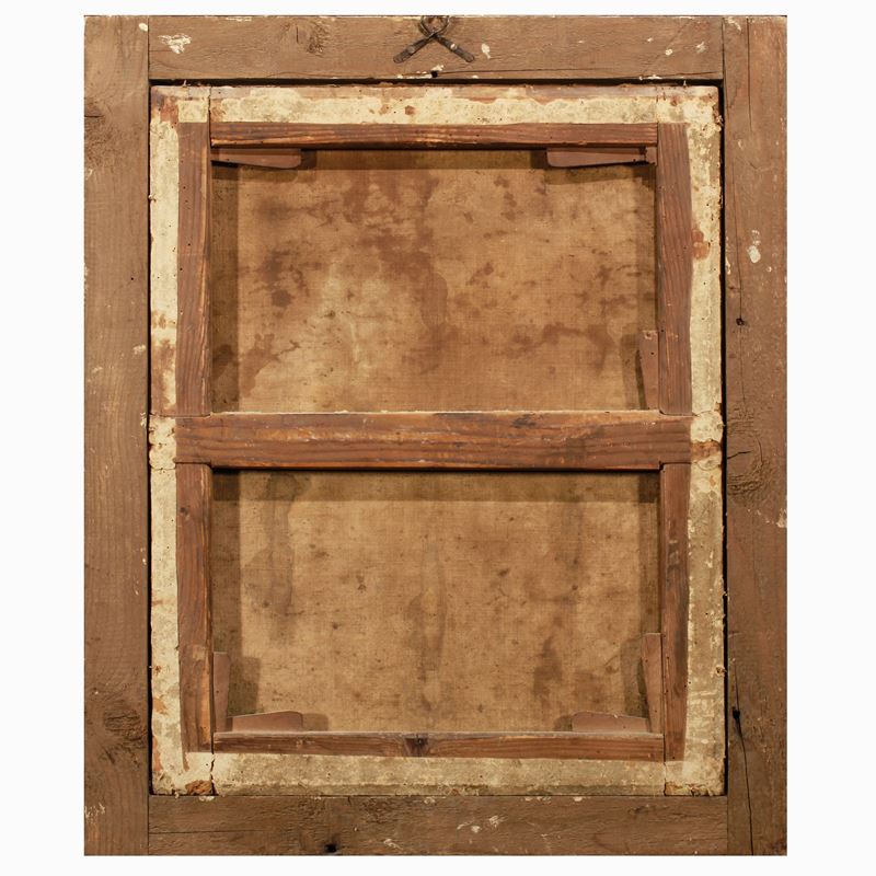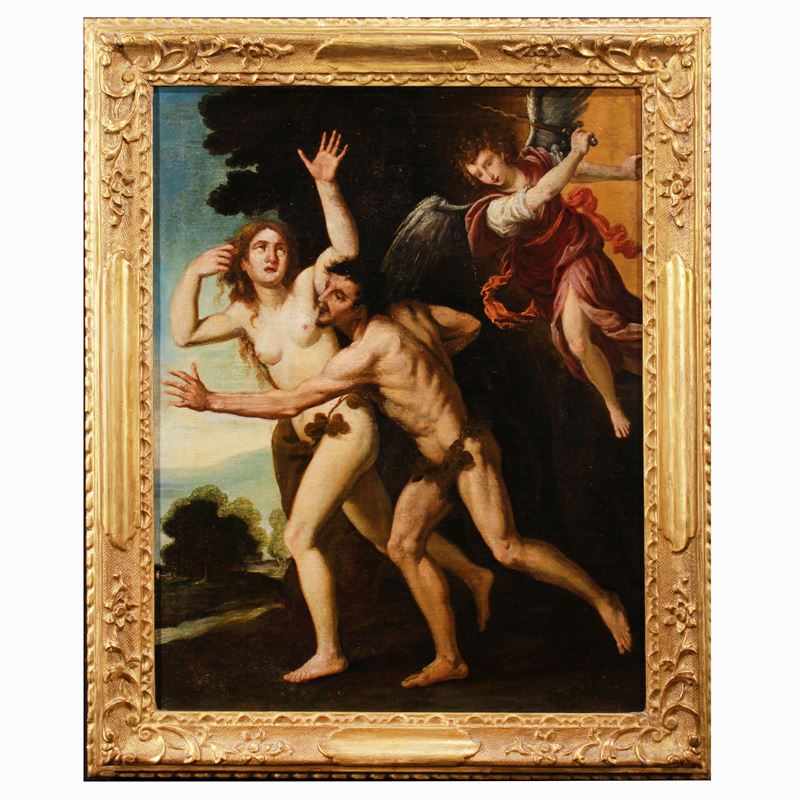 "Cacciata di Adamo ed Eva dal Paradiso terrestre", olio su tela, entro cornice in legno dorato