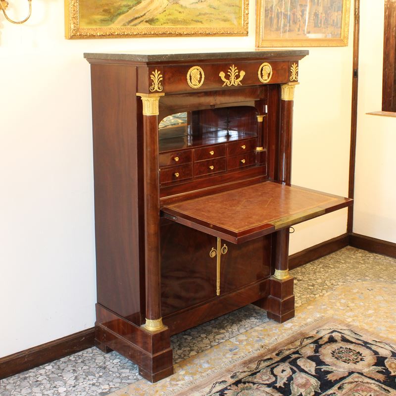 Secretaire Impero in mogano e piuma di mogano, Francia, XIX sec.