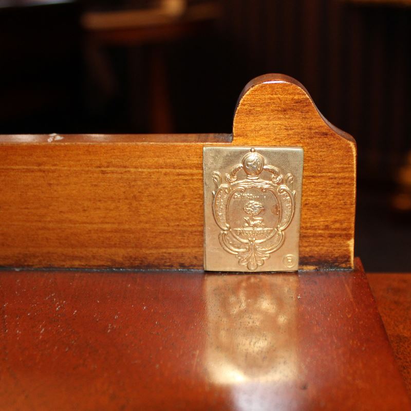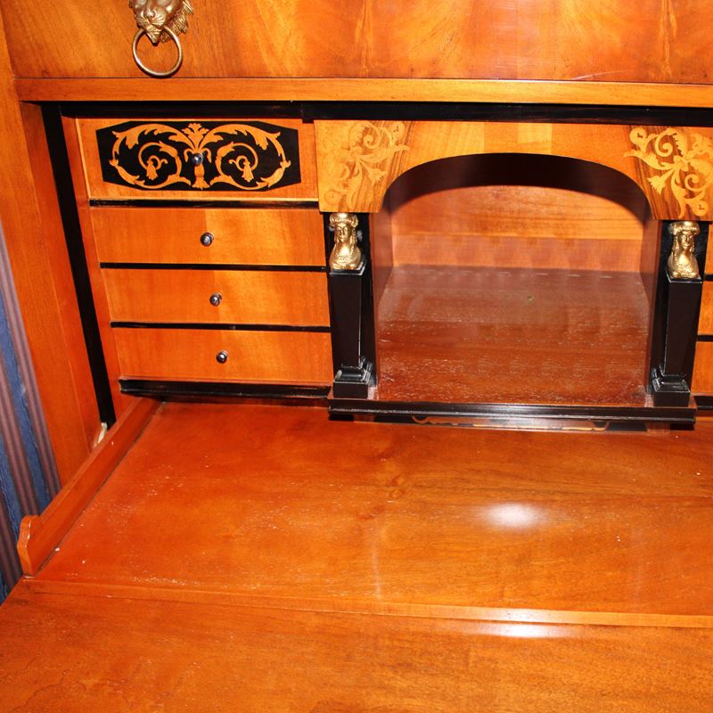 fronte a tre cassetti con calatoia celante tiretti e scomparti vari, parte superiore con ulteriore sportello delimitato da cariatidi, maniglie e fregi in bronzo dorato