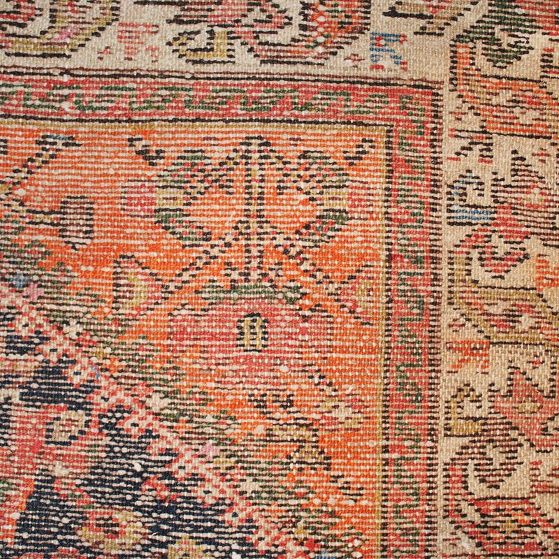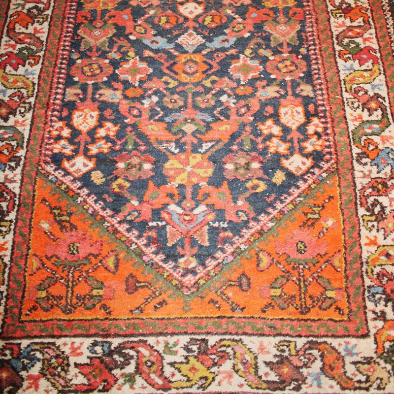 decorato con motivi geometrici, floreali e vegetali su fondo blu e rosso, difetti