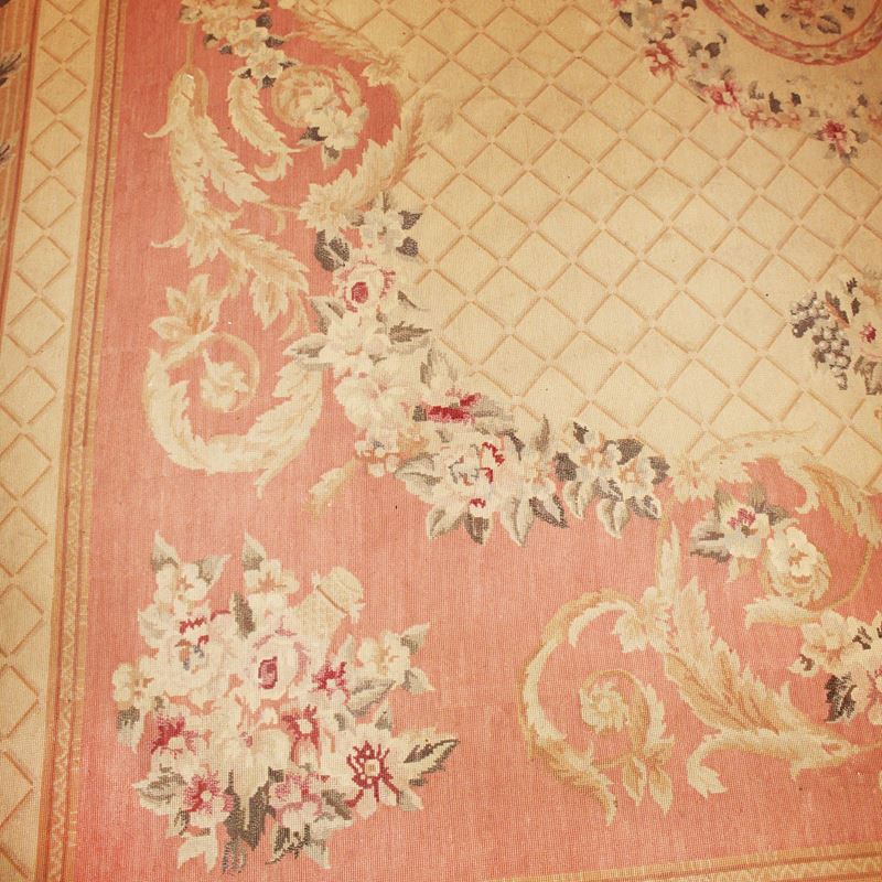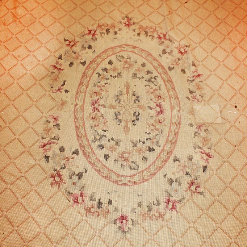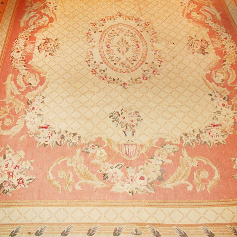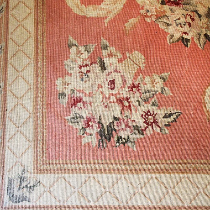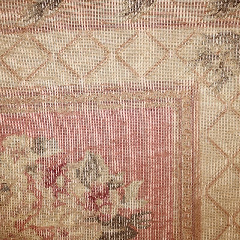 decorato con motivi floreali, vegetali e geometrici su fondo beige e rosa, lievi difetti