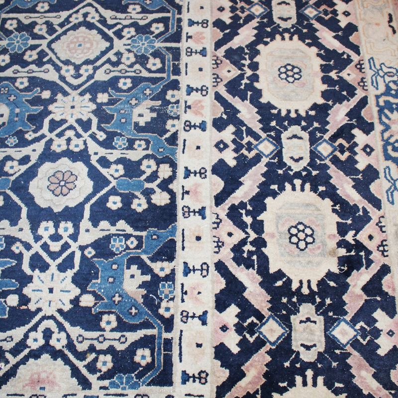 decorato con motivi floreali e geometrici su fondo blu e beige, usure e difetti