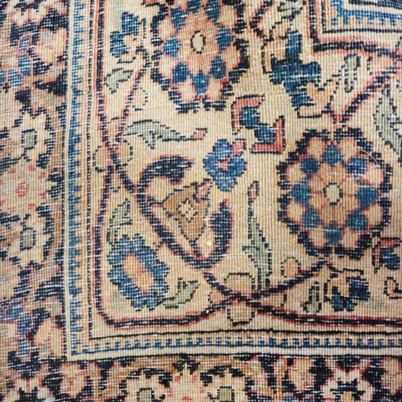 decorato con motivi floreali e vegetali su fondo rosso e blu, difetti