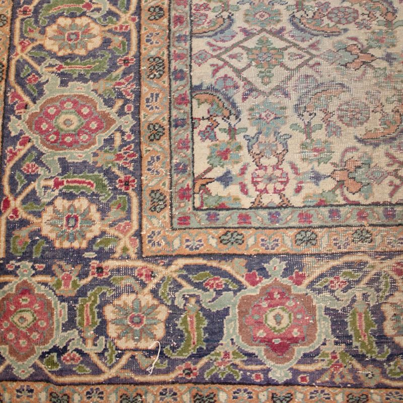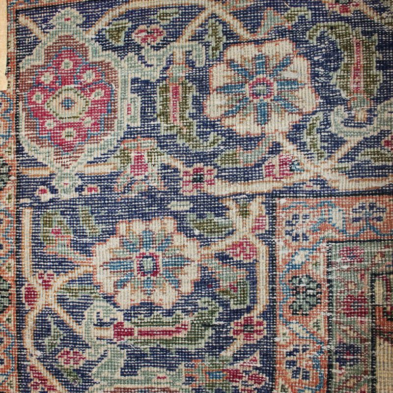 decorato con motivi vegetali e floreali su fondo multicolor, usure e difetti