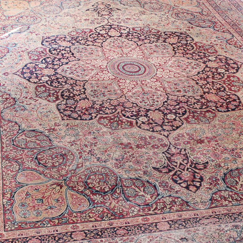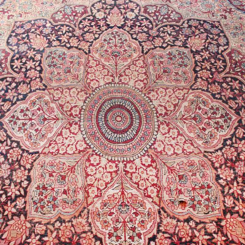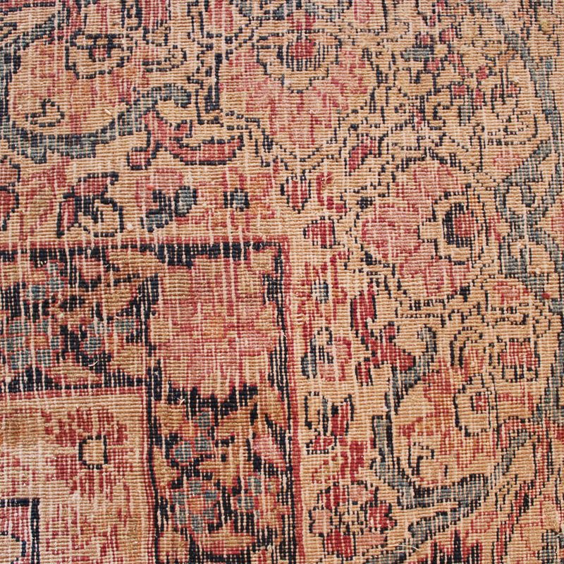 decorato con motivi vegetali e floreali su fondo multicolor, usure