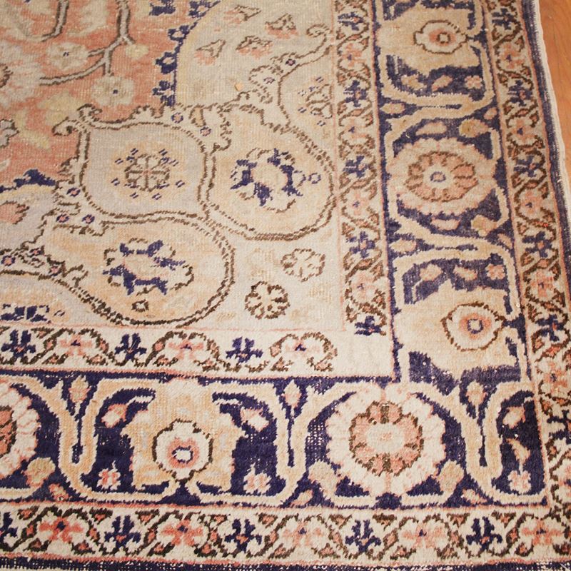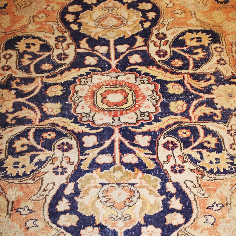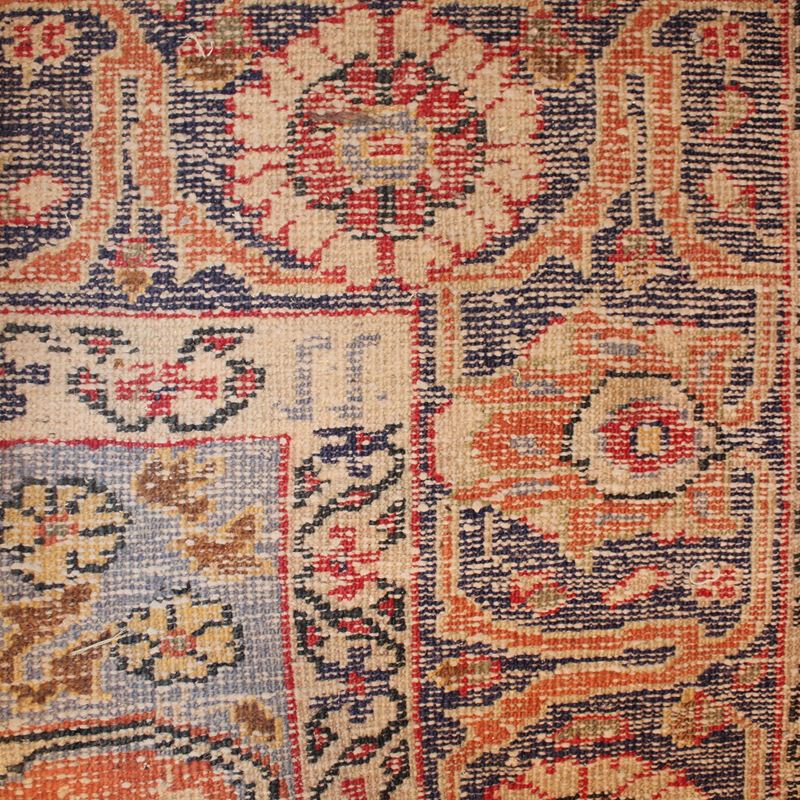 decorato con motivi vegetali e floreali su fondo beige e arancio, usure e difetti