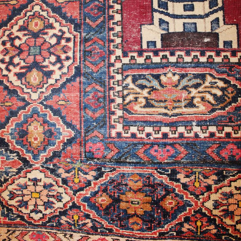 decorato con motivi floreali e geometrici su fondo rosso e blu