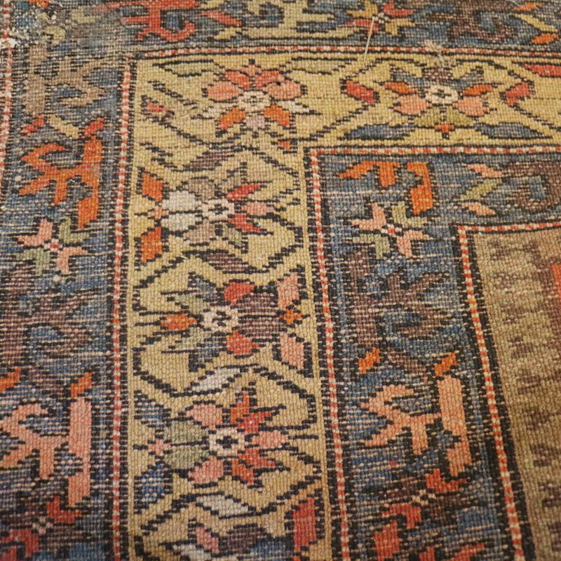 decorato con motivi floreali e vegetali su fondo rosso e blu, difetti