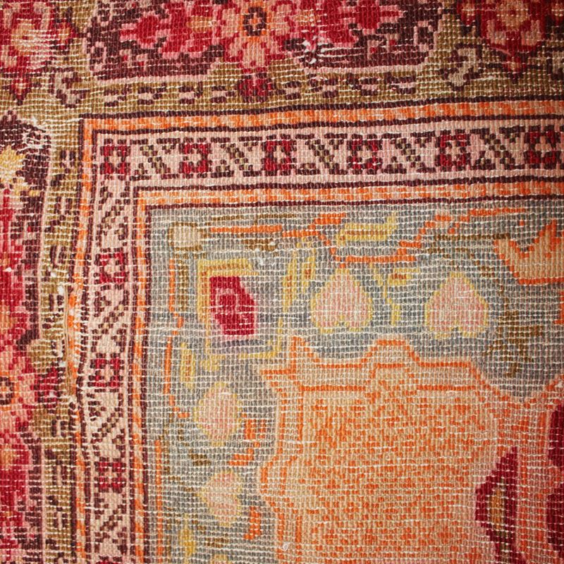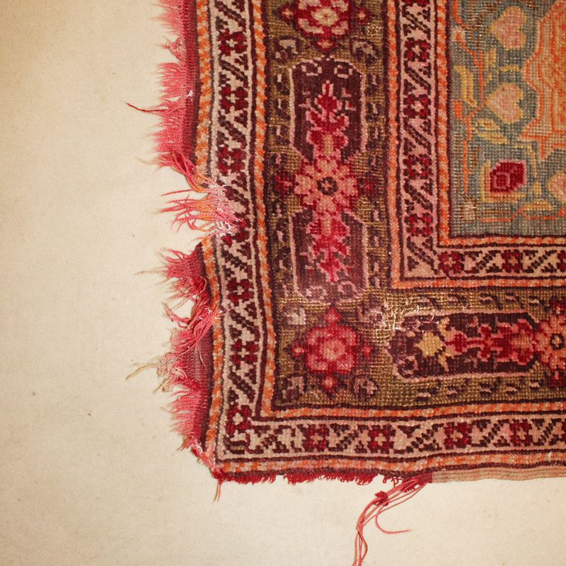 decorato con motivi vegetali e floreali su fondo rosso, difetti e mancanze
