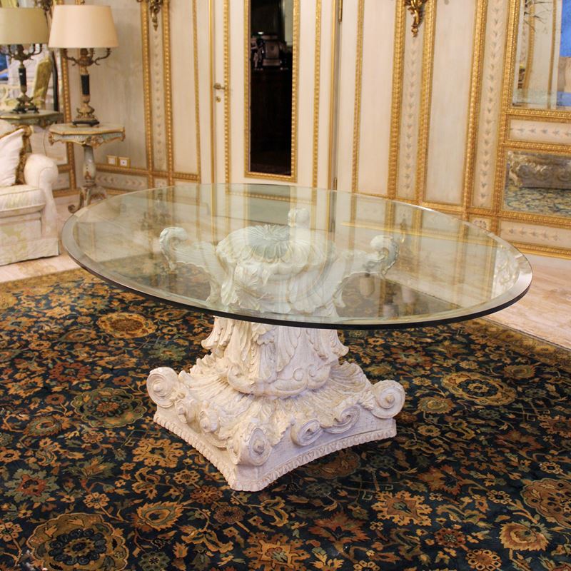 piano ovale in vetro molato poggiante su base laccata e riccamente intagliata con motivi di volute contrapposte