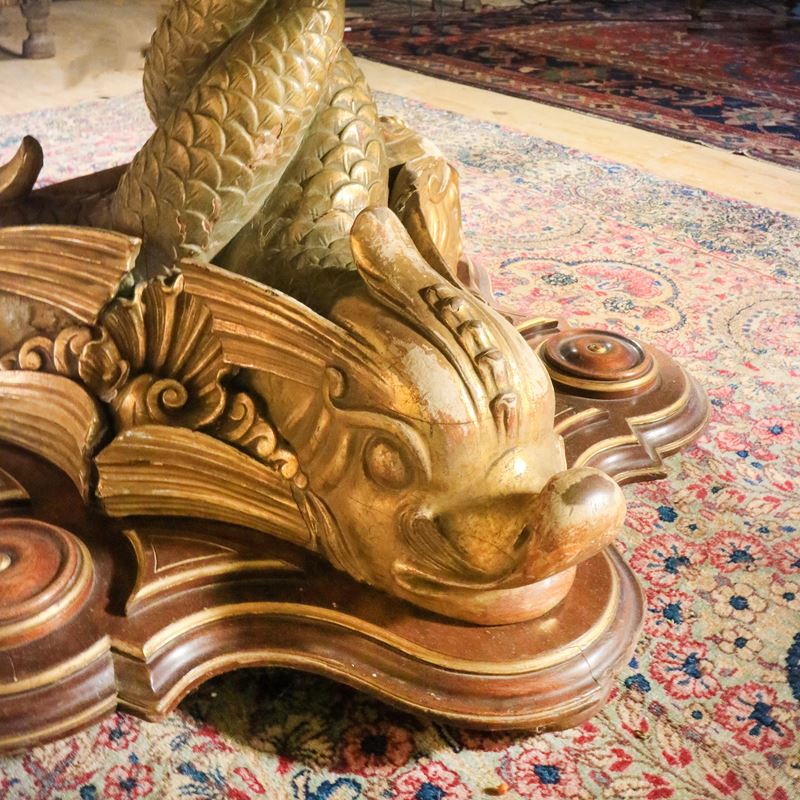 piano circolare poggiante su base parzialmente dorata e riccamente intagliata con delfini mitologici, difetti