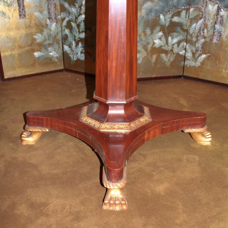 piano ovale, base ottagonale decorata con elementi in legno dorato poggiante su piedi ferini