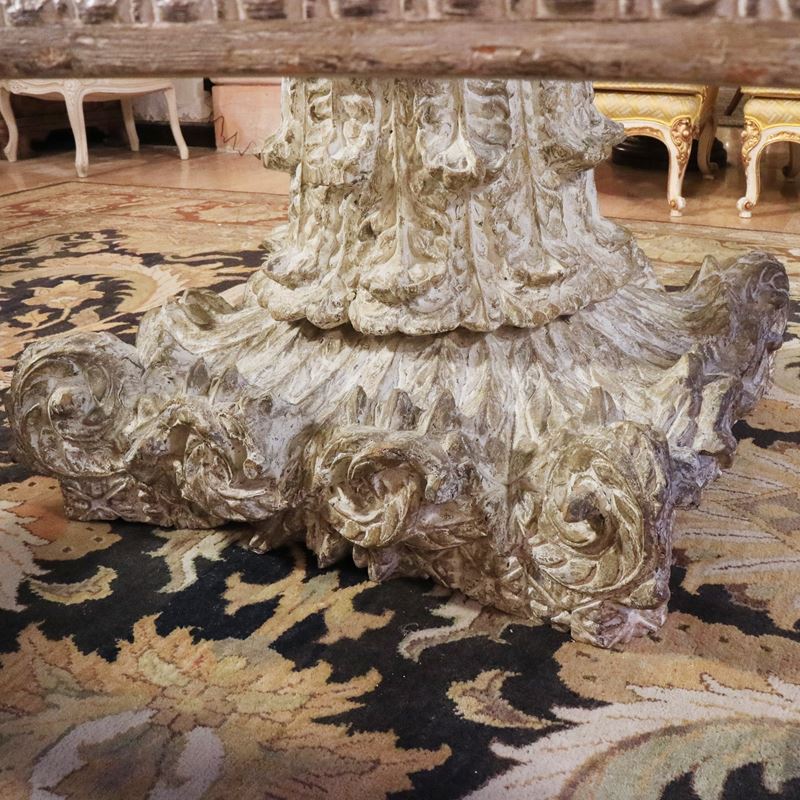 in legno laccato, piano ottagonale in vetro poggiante su base decorata con foglie d'acanto e volute vegetali