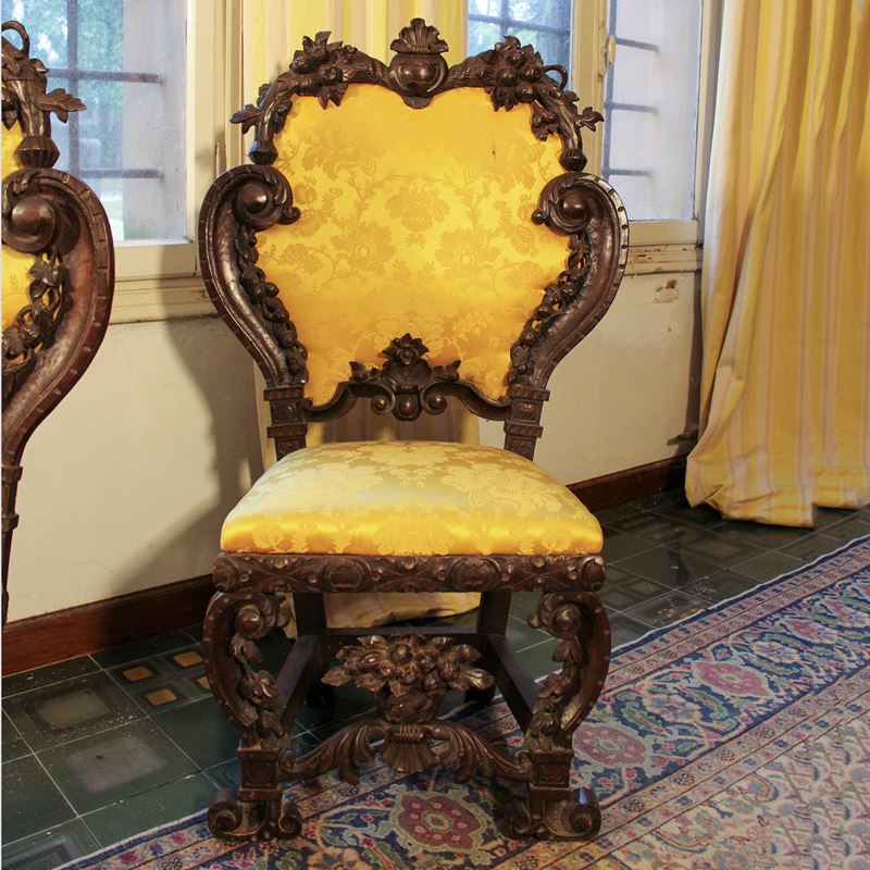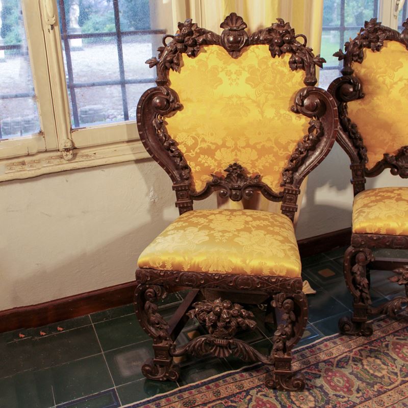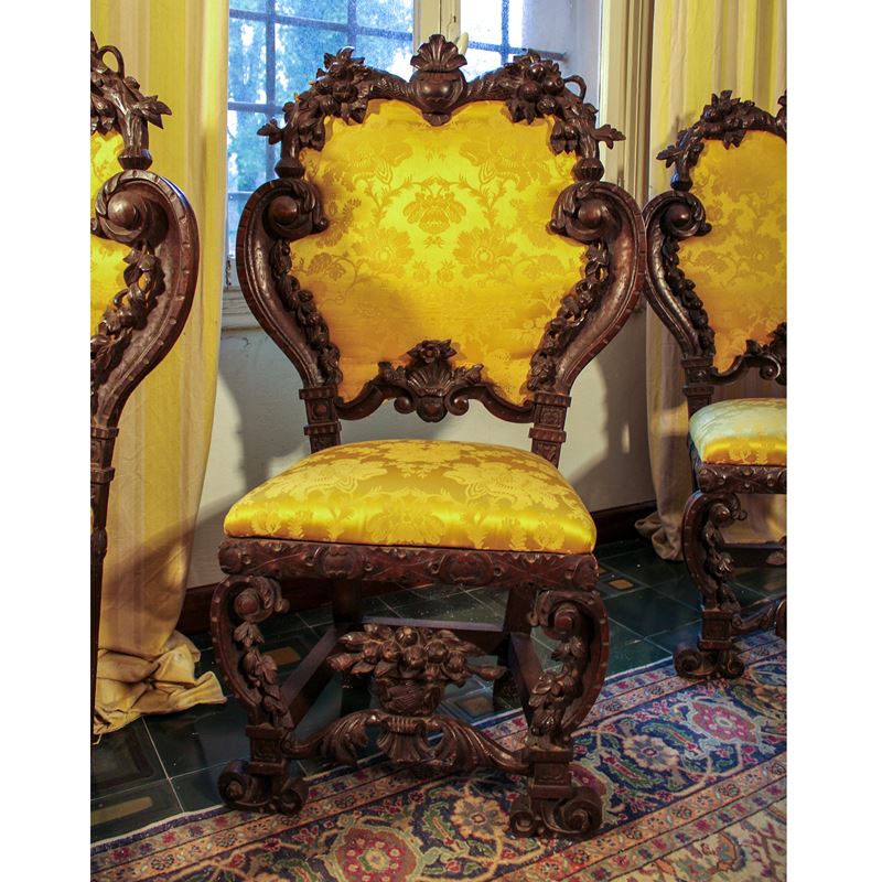 strutture di linea sagomata riccamente intagliate con ghiande, motivi vegetali e di volute, sedute e schienali imbottiti e rivestiti in tessuto