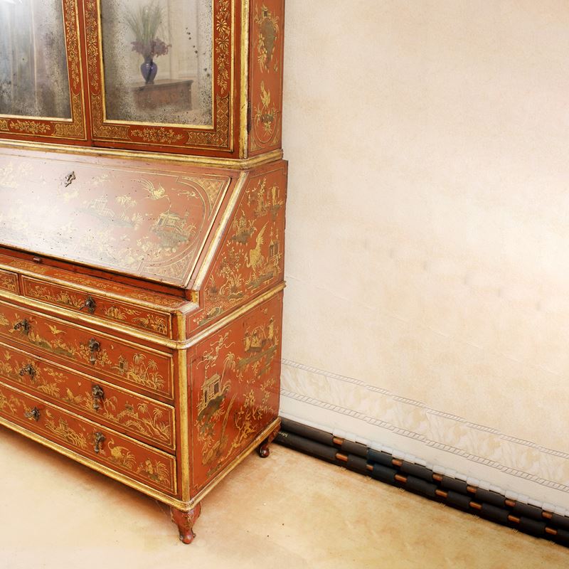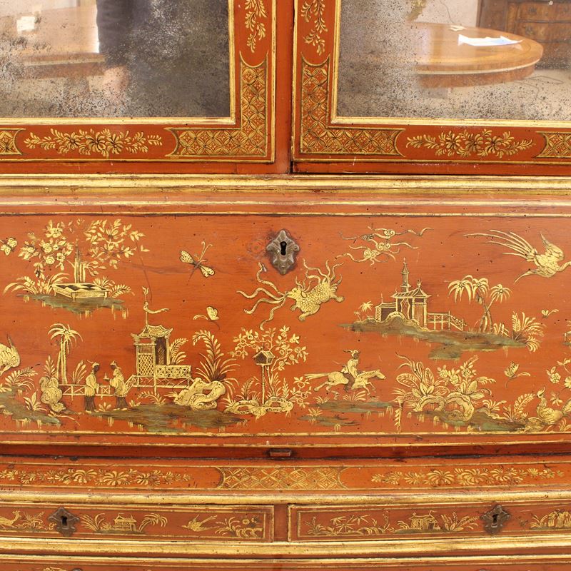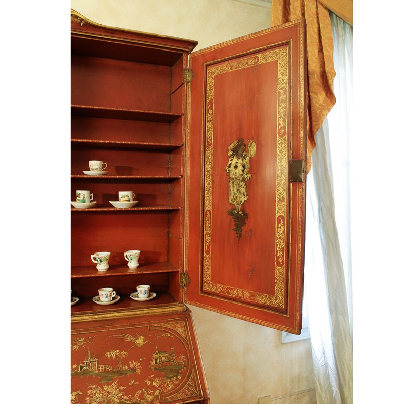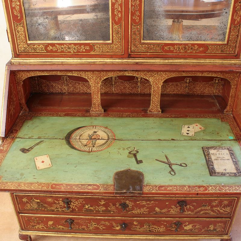 corpo interamente decorato in lacca rossa e in oro con motivi a chinoiserie, fronte con due sportelli, una ribalta con interno decorato in policromia con carte da gioco, maschere carnevalesche ed oggetti vari, e cinque cassetti sottostanti
