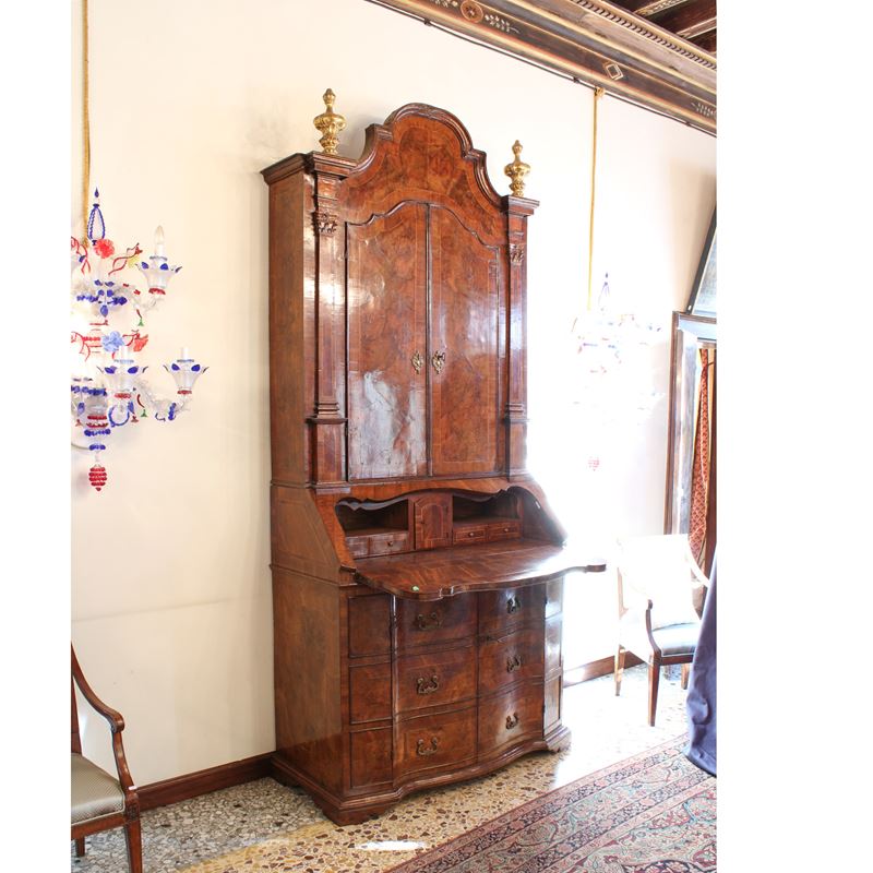 parte superiore a due sportelli delimitati da lesene con capitelli sormontate da due pinnacoli in legno dorato, parte inferiore con calatoia celante tiretti e scoparti vari e due sportelli sottostanti a simulare dei cassetti