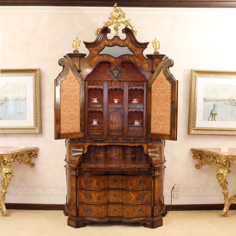 fronte con calatoia e numerosi sportelli e vani, cimasa decorata con elementi in legno dorato traforati ed intagliati con volute vegetali