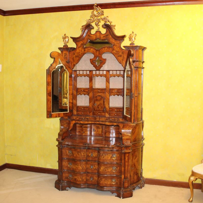 parte superiore a quattro sportelli con all'interno tiretti e scomparti vari, parte inferiore a ribalta con tre cassetti e due sportelli laterali