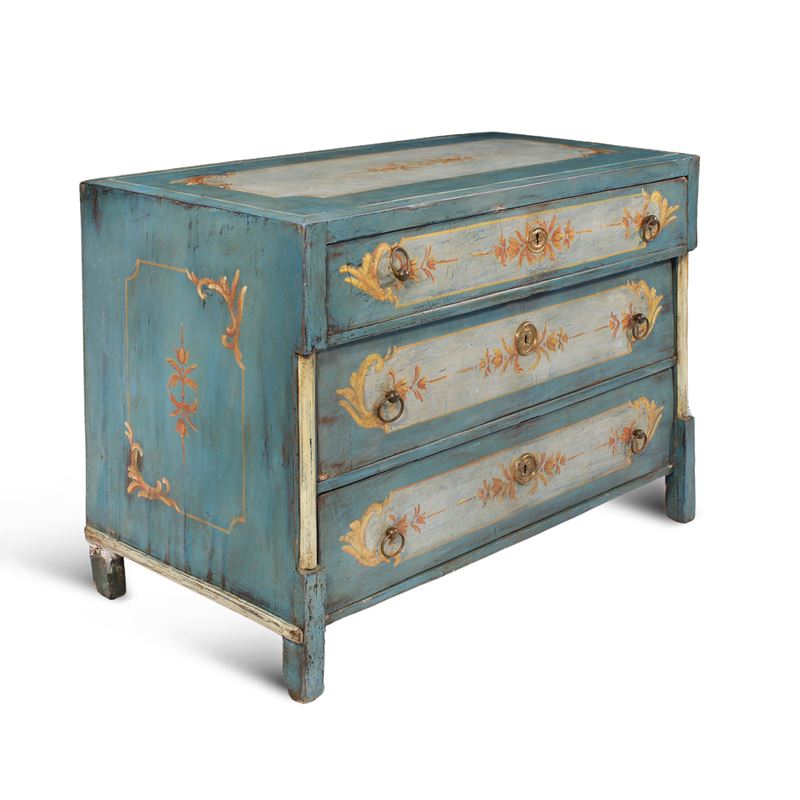 in policromia e decorato con motivi vegetali, fronte a tre cassetti