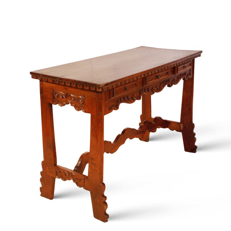 piano rettangolare con tre cassetti sottostanti, poggiante su sostegni riuniti al centro da crociera, lievi difetti