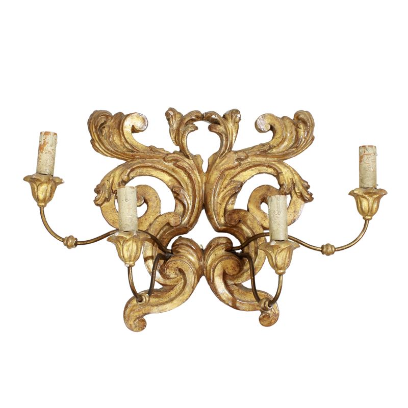 Coppia di appliques a quattro luci in legno dorato, Italia, XX sec.