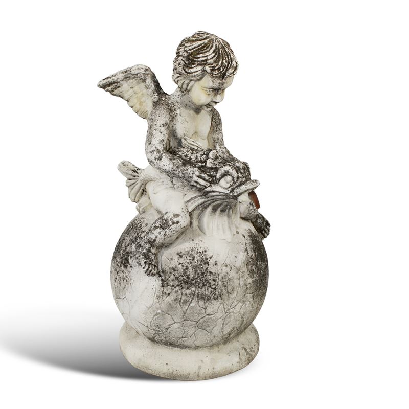 raffigurante un putto alato e un pesce poggianti su una sfera