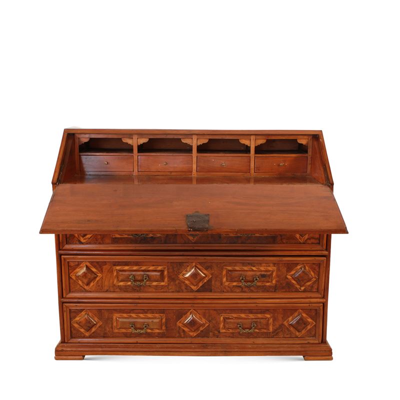 fronte con calatoia celante tiretti e scomparti vari, con tre cassetti sottostanti