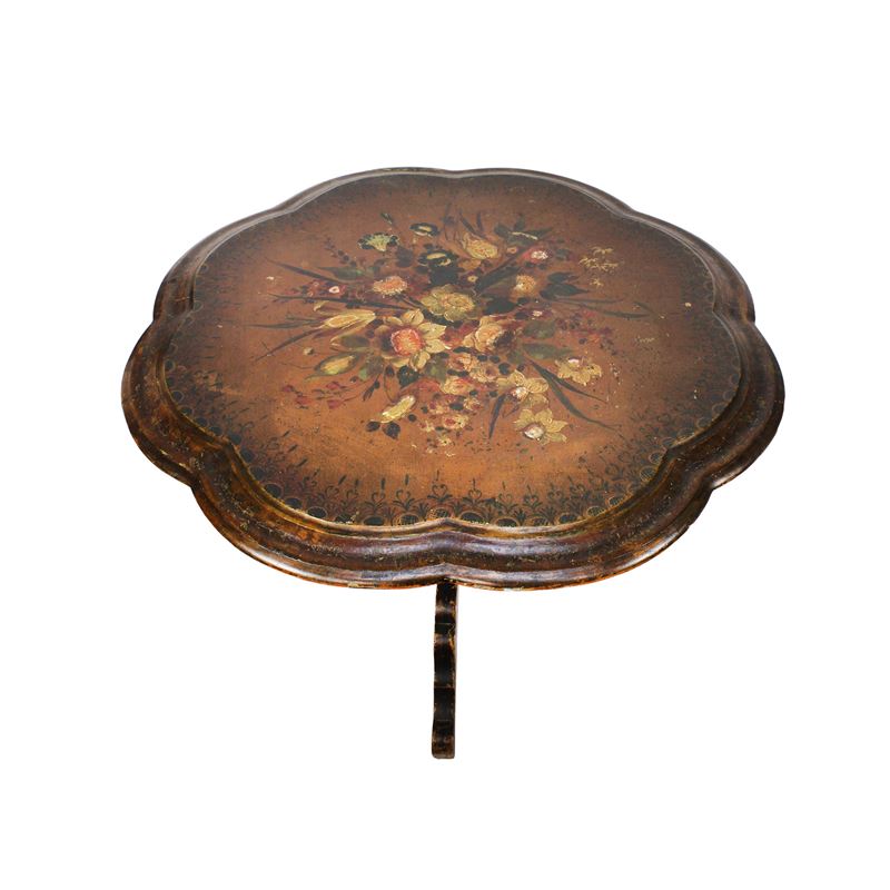 piano sagomato dipinto in policromia con motivi vegetali e floreali, poggiante su base a tripode