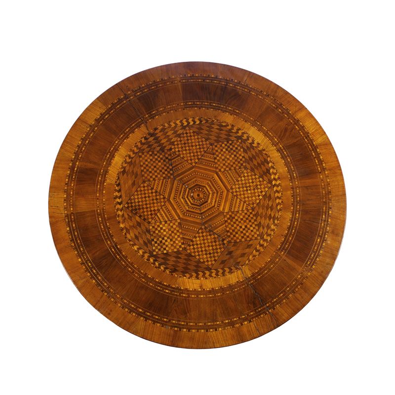 piano circolare e fascia sottostante intarsiati in legni vari, poggiante base tornita con terminali a tripode