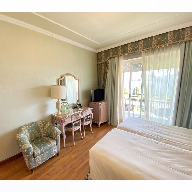 completa di: due letti ad una piazza, una testata con comandi, due abat-jour, due comodini, uno scrittoio con due sedie, una lampada in metallo verniciato e dorato, due specchiere, un mobile porta tv e frigobar, un poggiavaligie, una plafoniera, un appendiabiti con placche raffiguranti scene equestri, ed un tendaggio completo di misure 295x240 cm.